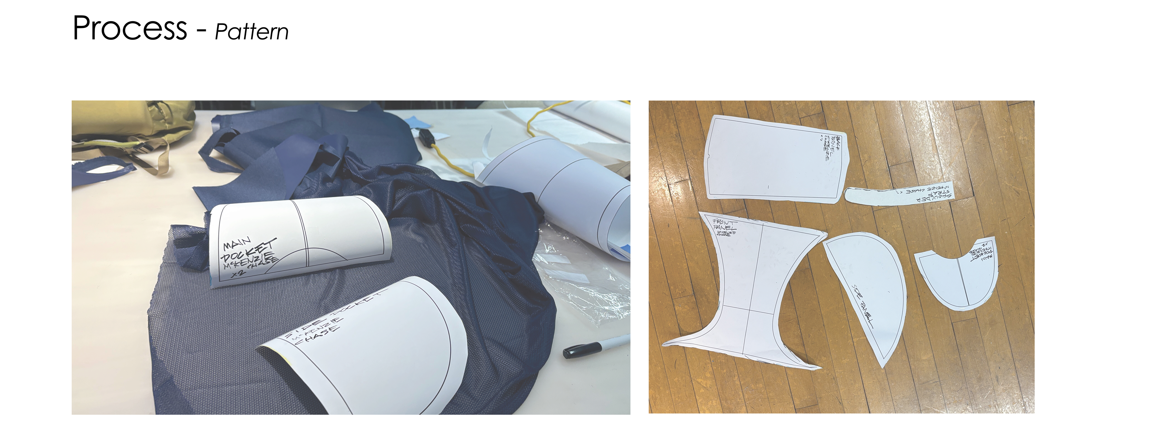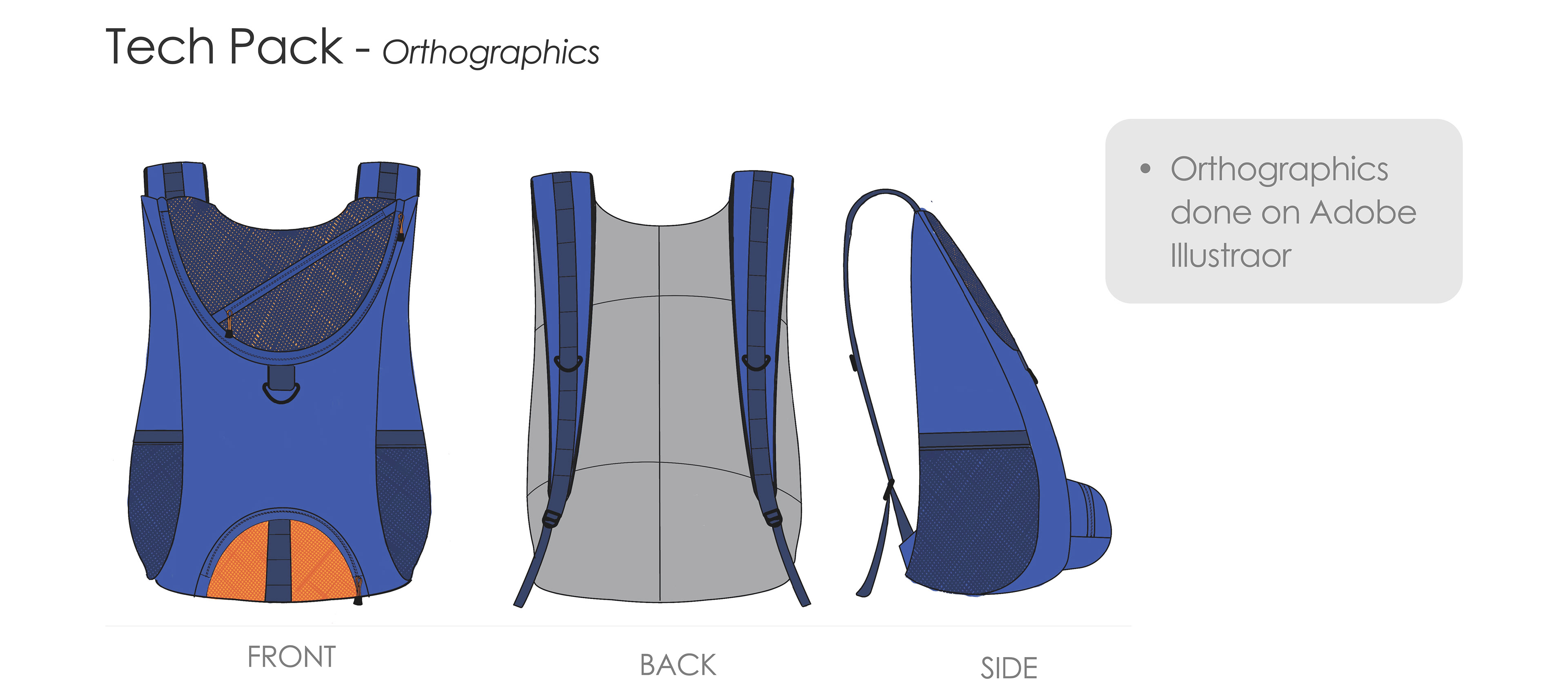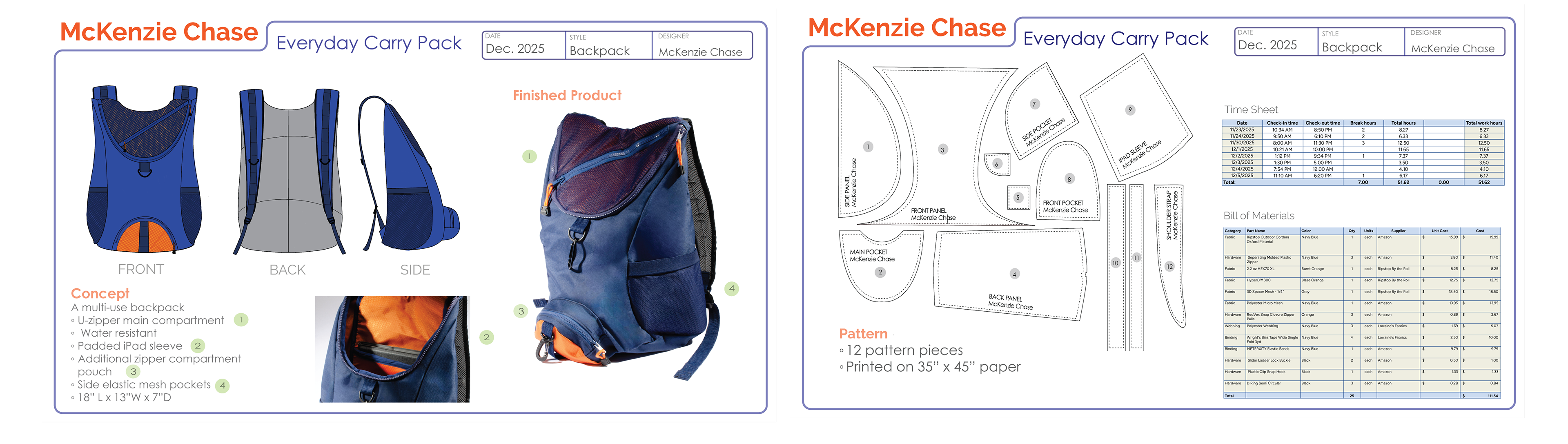 Tech Pack including: orthographic drawings, callouts, final pattern, bill of materials, and time sheet