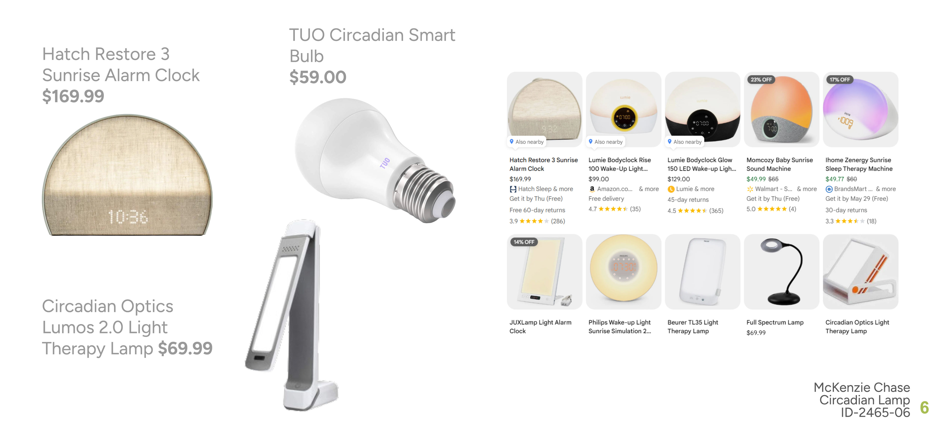 The most popular circadian product is the Hatch Alarm Clock, which has a heavy influence on the market, as a lot of it is variants of Hatch with a similar form. There are also circadian light bulbs being sold, as well as light therapy devices.